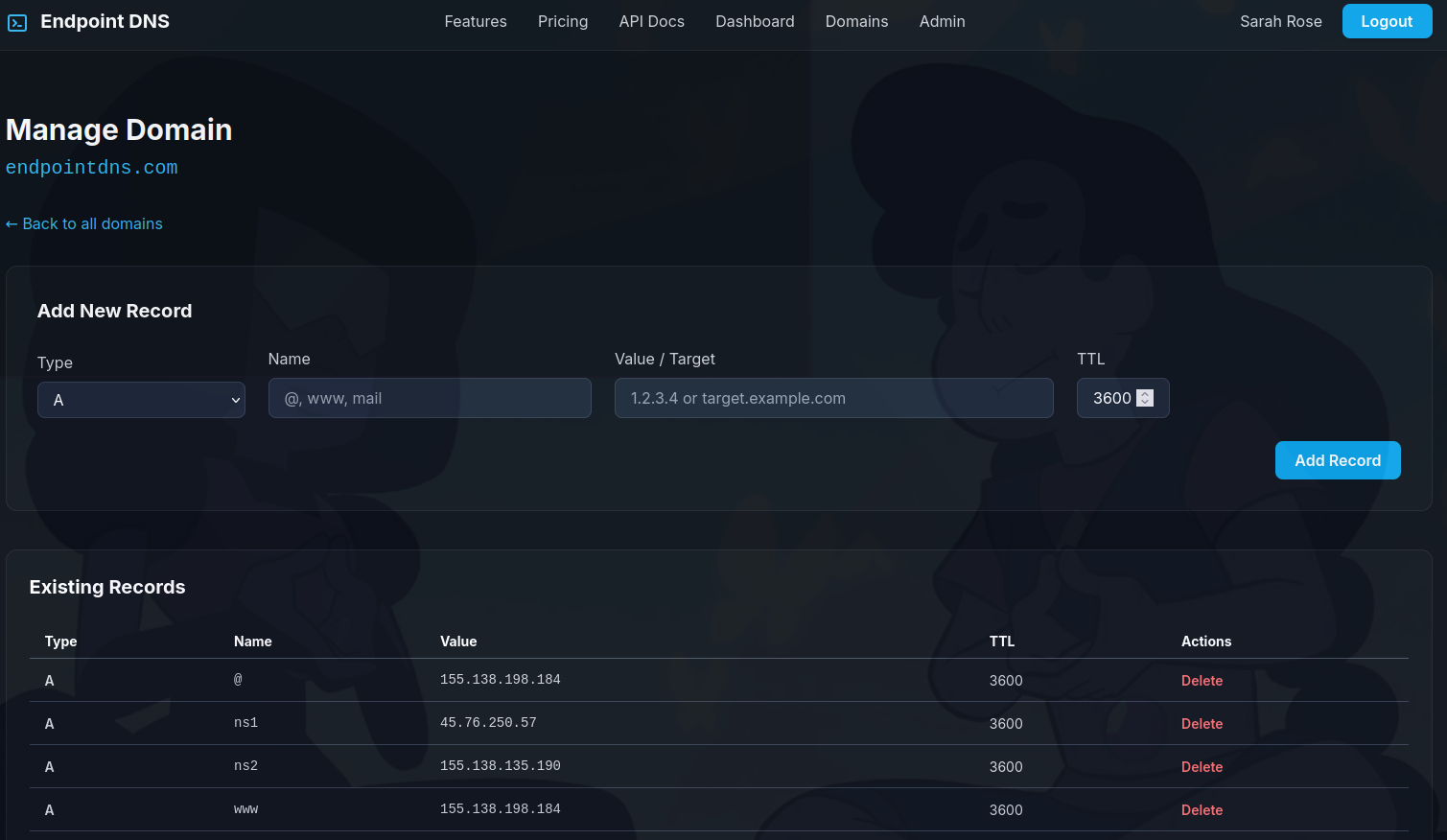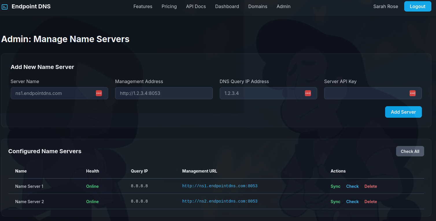 EndpointDNS is a developer-focused DNS hosting service built on a modern, distributed architecture. It uses an API-centric model where a central controller communicates with multiple remote name servers to manage and serve DNS records, ensuring high availability and efficient synchronization.